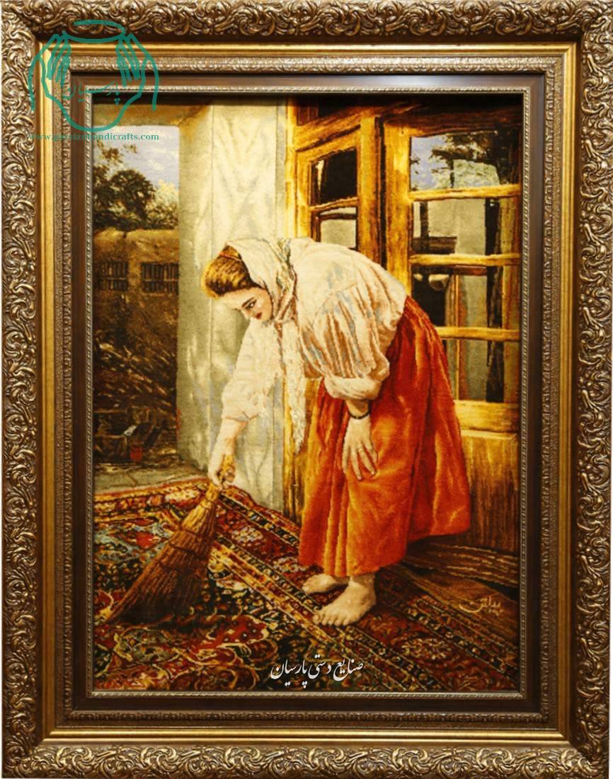 مشخصات تابلو فرش دستبافت چله ابریشم دختر جاروکش