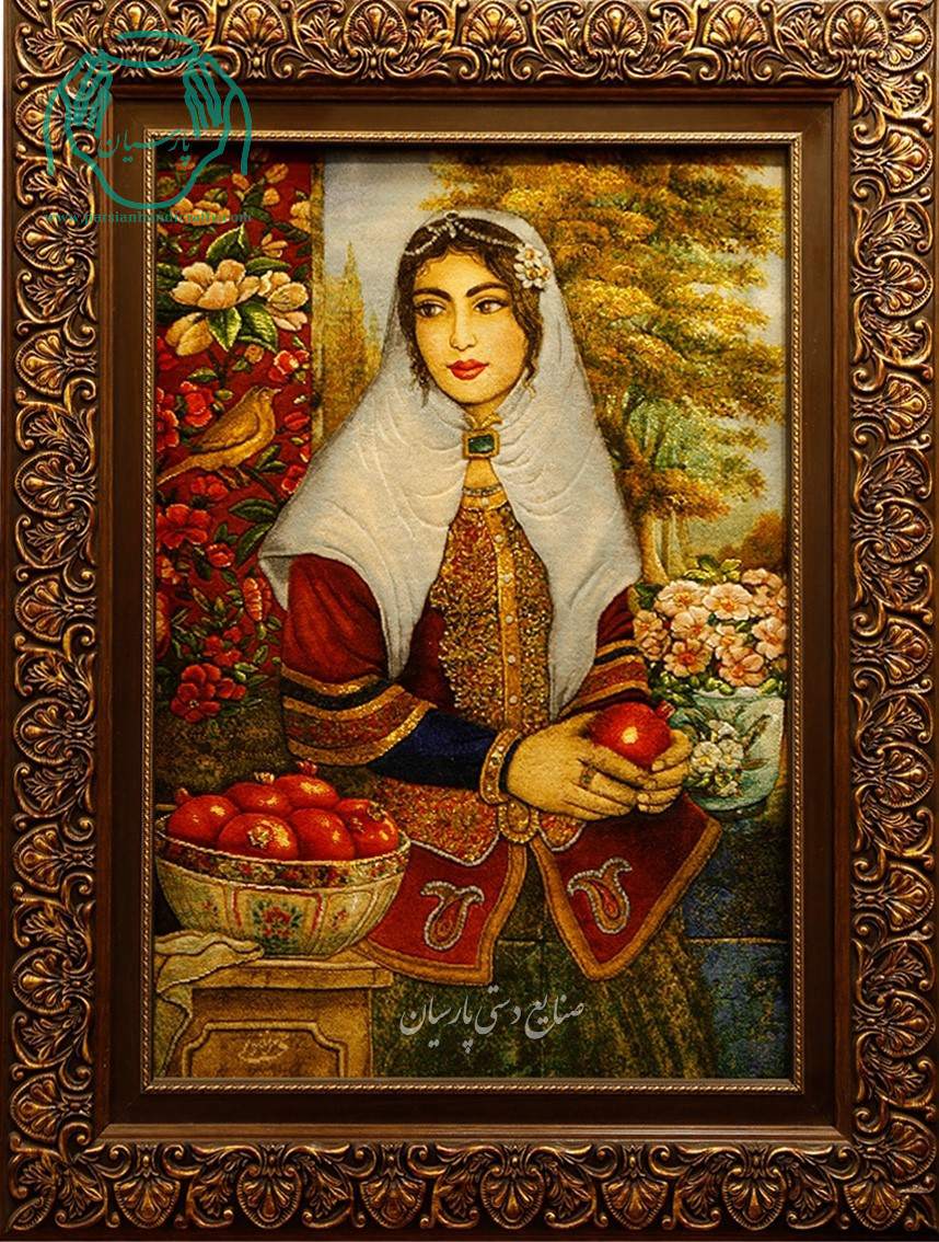 مشخصات تابلو فرش دستبافت چله ابریشم دختر قاجارانار به دست برجسته