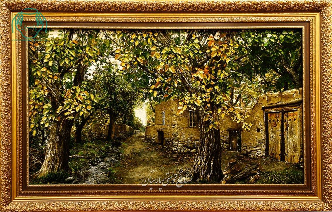 مشخصات تابلو فرش دستبافت چله ابریشم منظره کوچه باغ