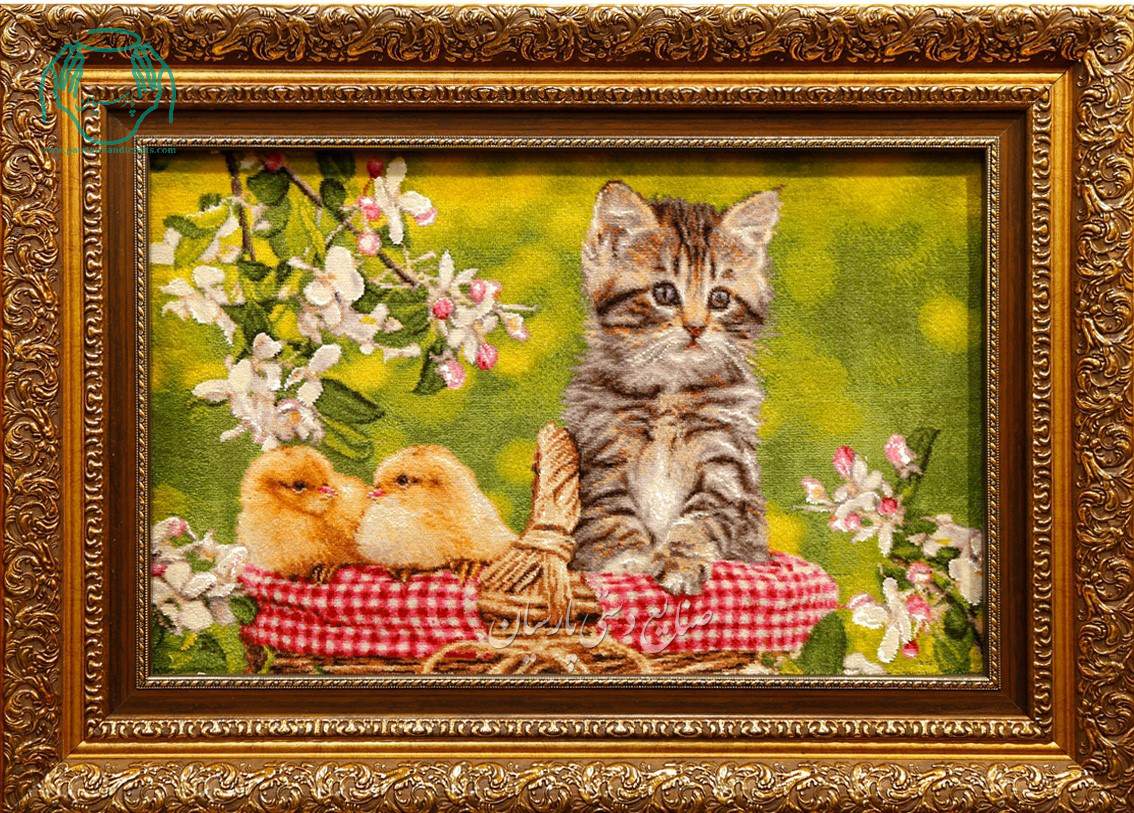 مشخصات تابلو فرش دستبافت چله ابریشم گربه و جوجه