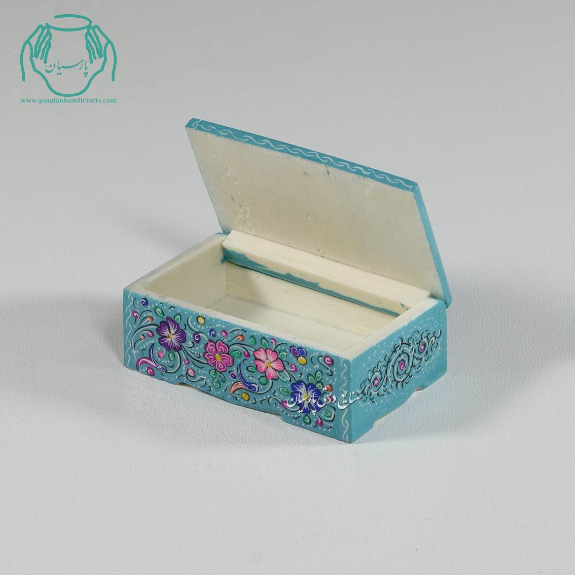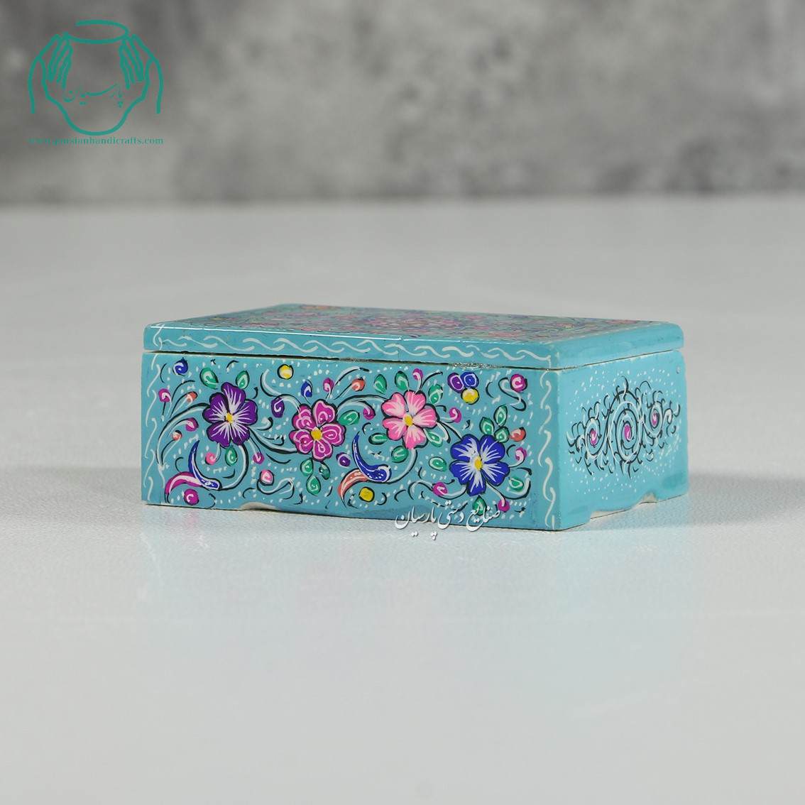 مشخصات جعبه کبریتی جواهرات استخوانی نقاشی گل زمینه فیروزه ای
