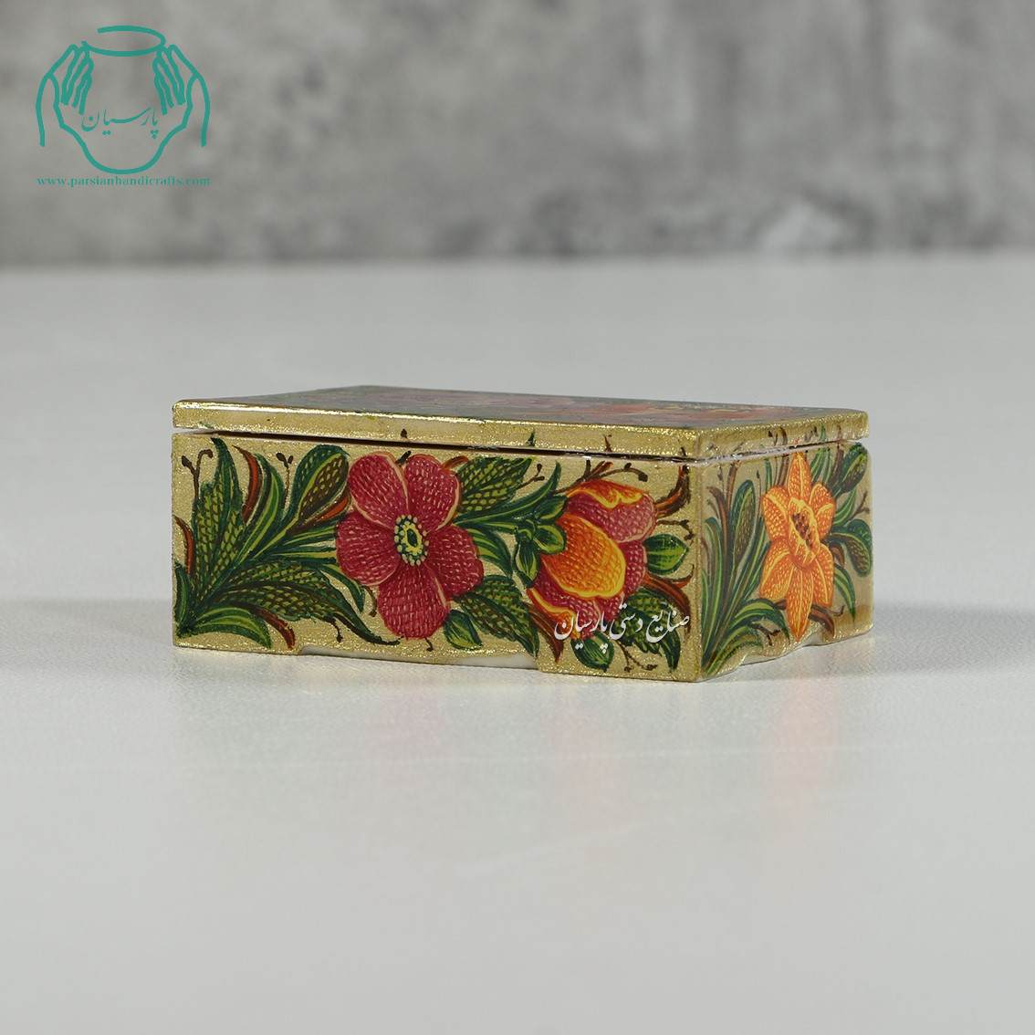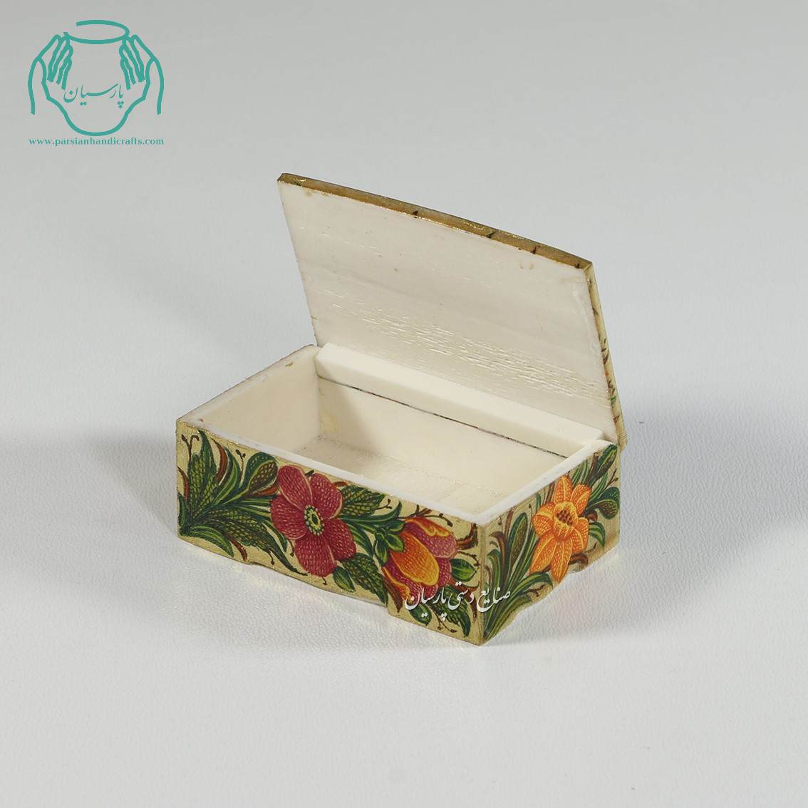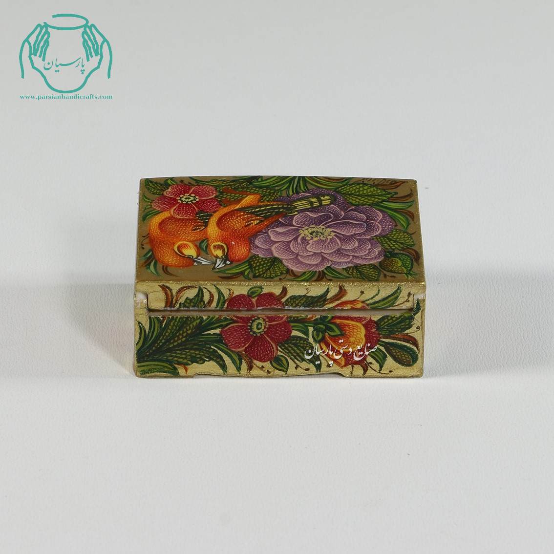 مشخصات جعبه کبریتی جواهرات استخوانی نقاشی گل و مرغ زمینه طلایی