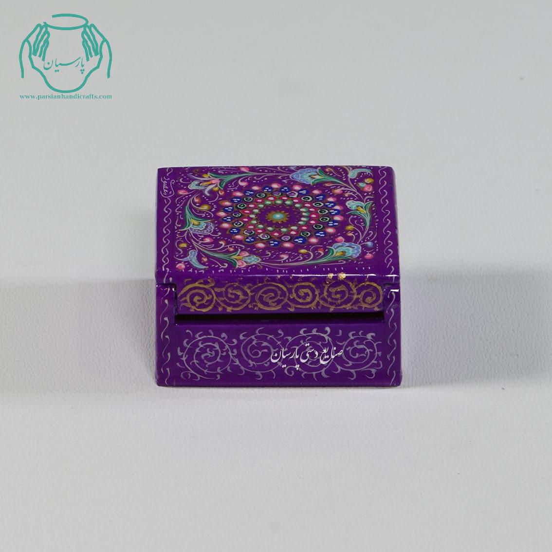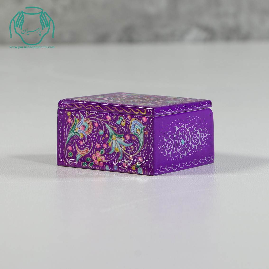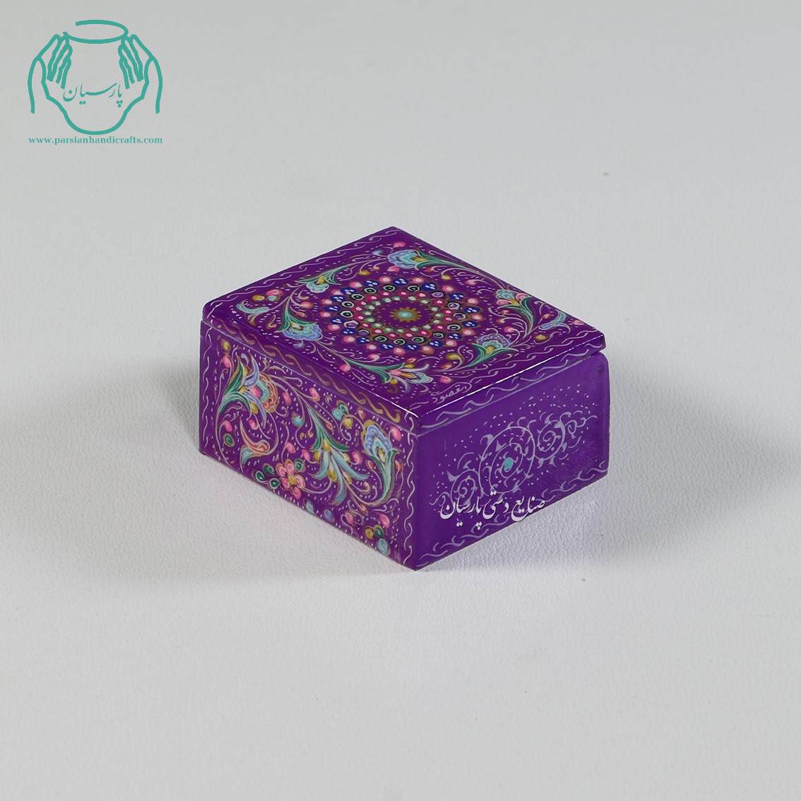 مشخصات جعبه کبریتی جواهرات استخوانی کوچک نقاشی گل و تذهیب زمینه بنفش