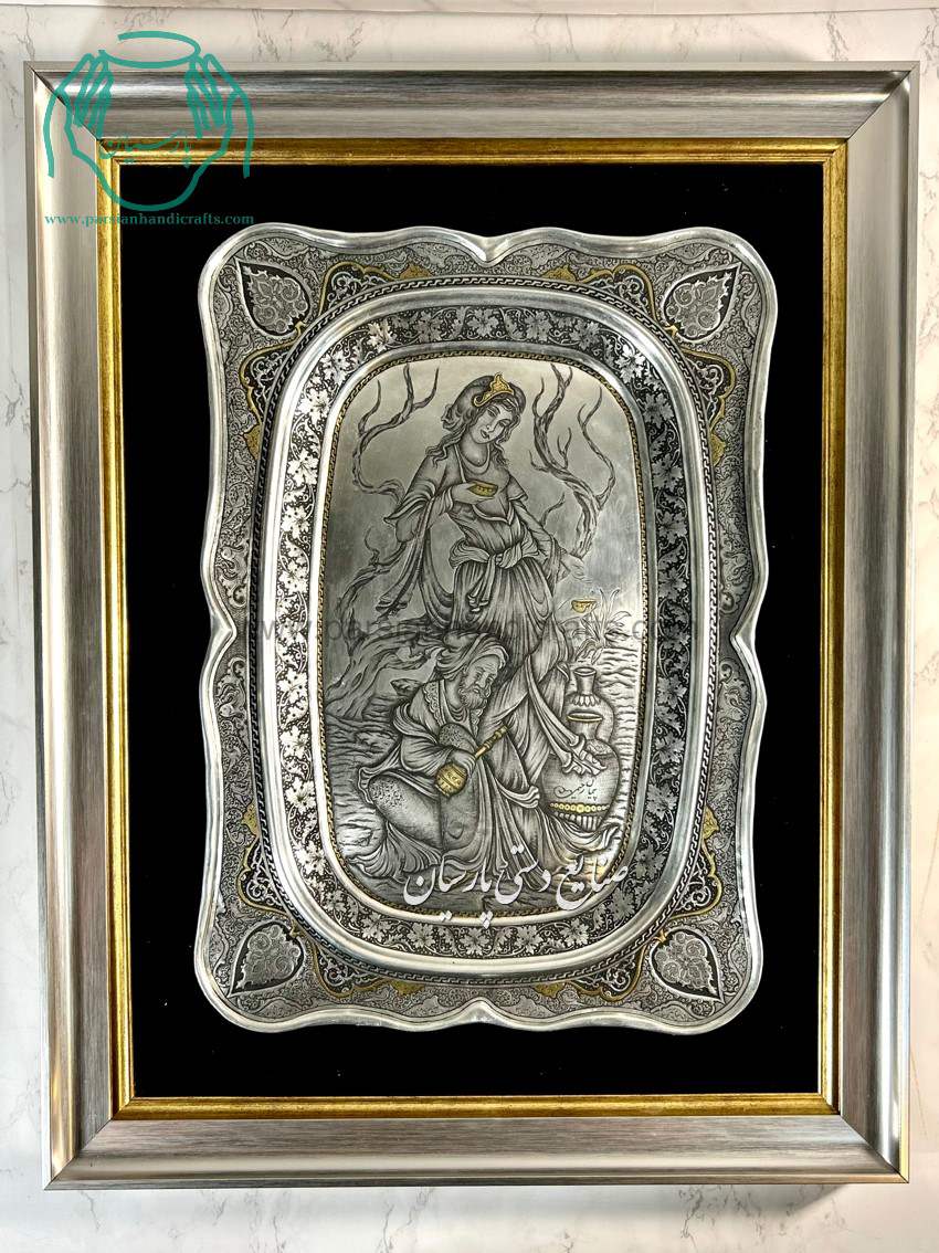 مشخصات سینی قلمزنی مسی دیوارکوب طرح گل و مرغ و لیلی مجنون